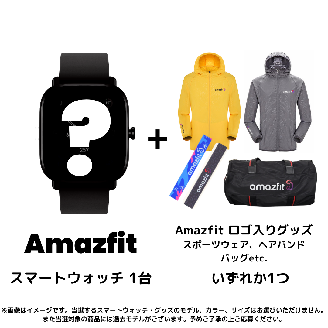 ・本キャンペーンはTwitterのAmazfit日本公式アカウント(https://twitter.com/AmazfitJapan)のみで開催される企画です。・ 未成年の方は、保護者の方に同意を得た上でご応募ください。・本キャンペーンプレゼントに関して、本ストアが提供する返品・交換保証サービスは対象外となります。モデルや色、サイズの指定・交換は対応いたしかねますので予めご了承下さい。・本キャンペーン終了後、万が一当社原因による商品の欠陥や不良などがあった場合も原則保証対応外となります。交換・返品・返金の対象とはなりませんのでご了承ください。