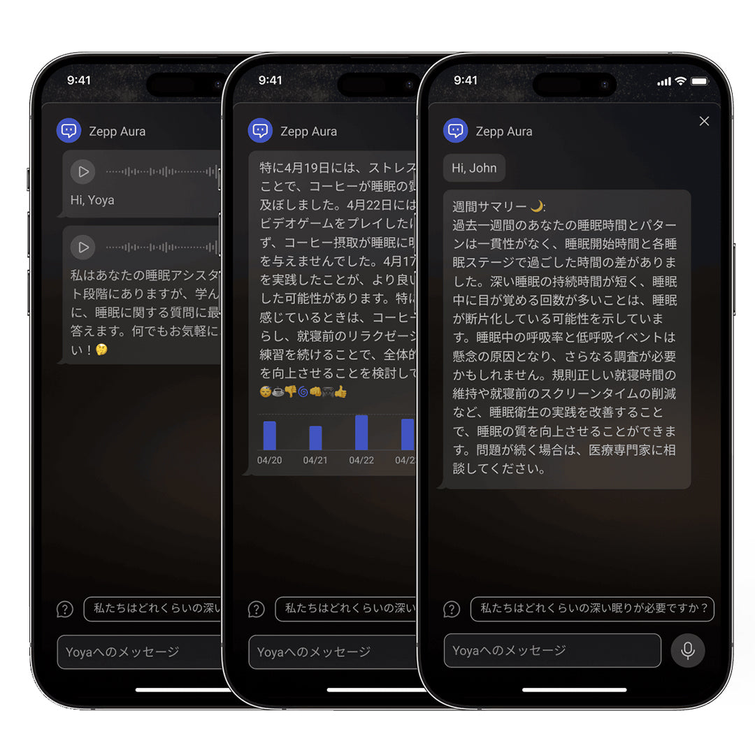 AI及び独自の特許技術を駆使したZepp Auraは、専門家のアドバイス・詳細な睡眠レポート・そして強力な洞察をすることで、より良い睡眠へと導きます。