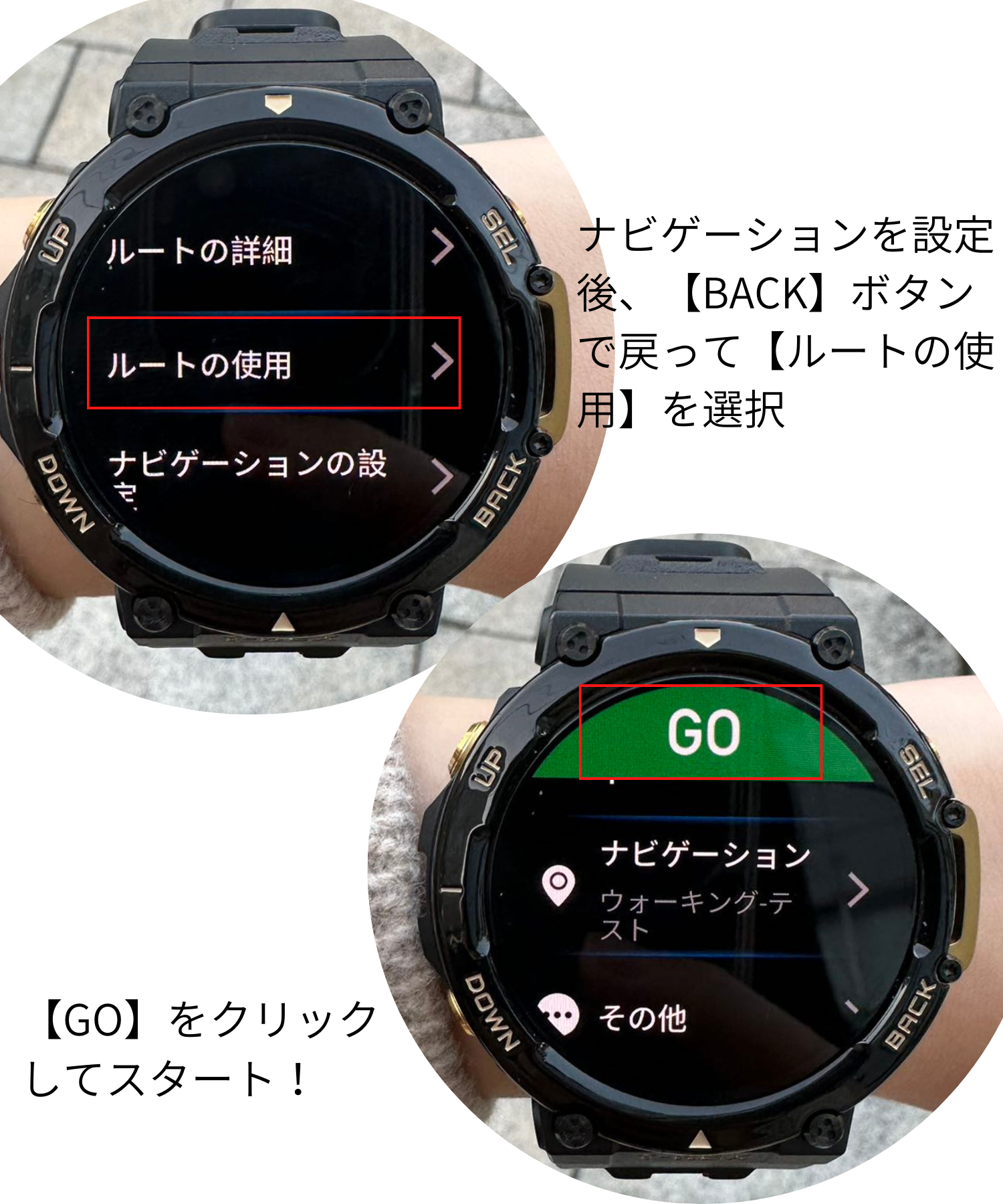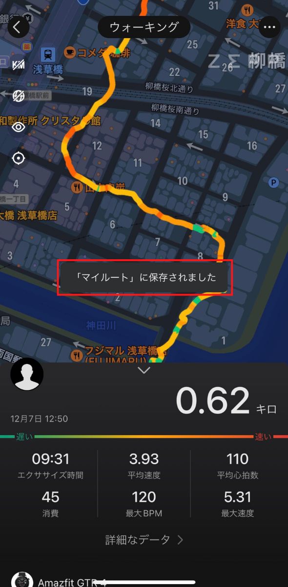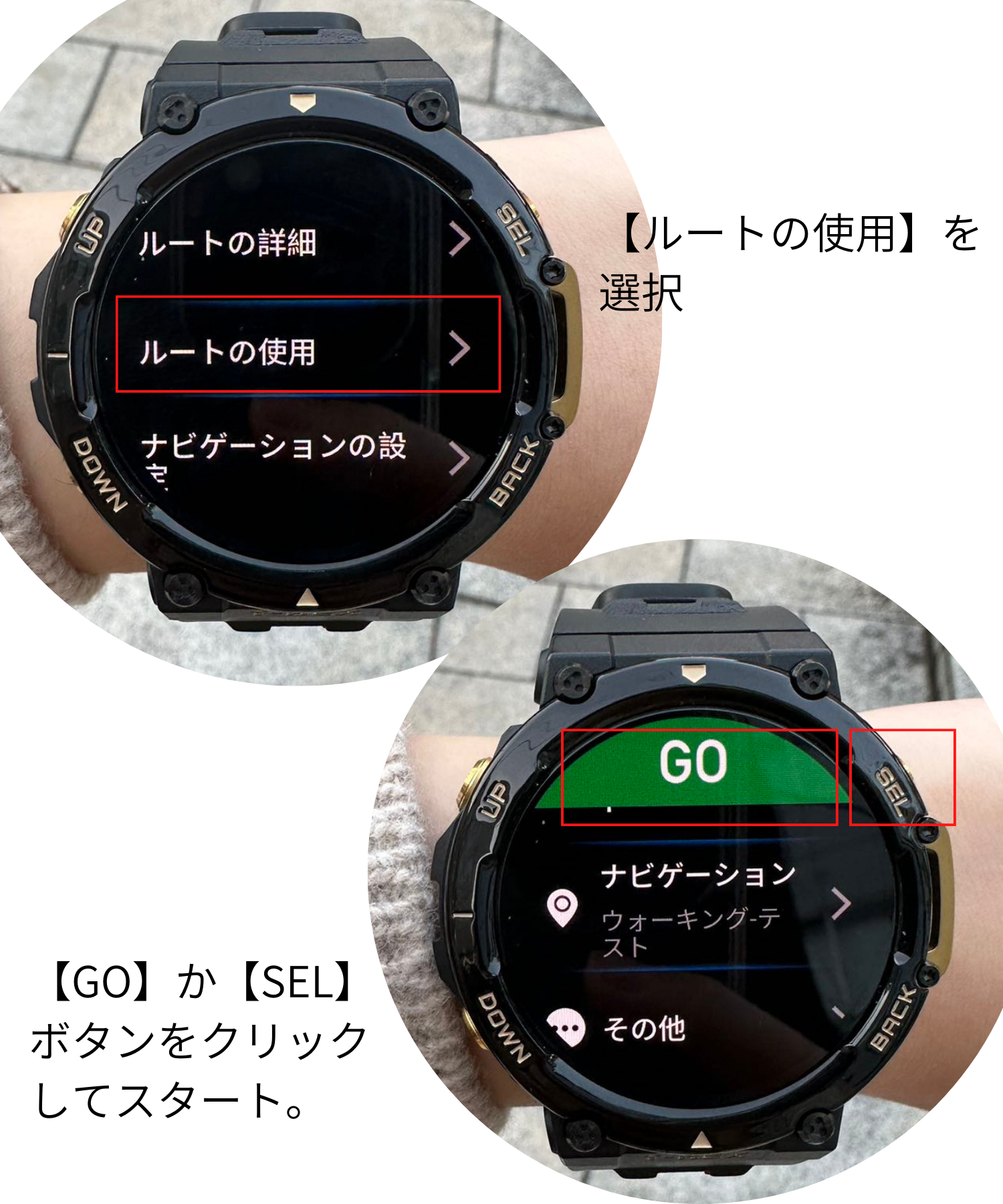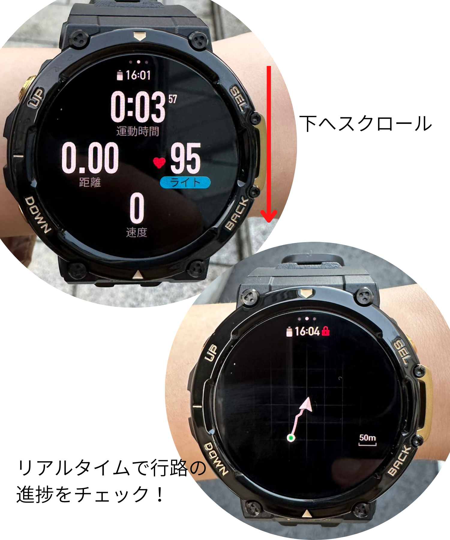ウォッチ上に歩いたルートをリアルタイム表示します。