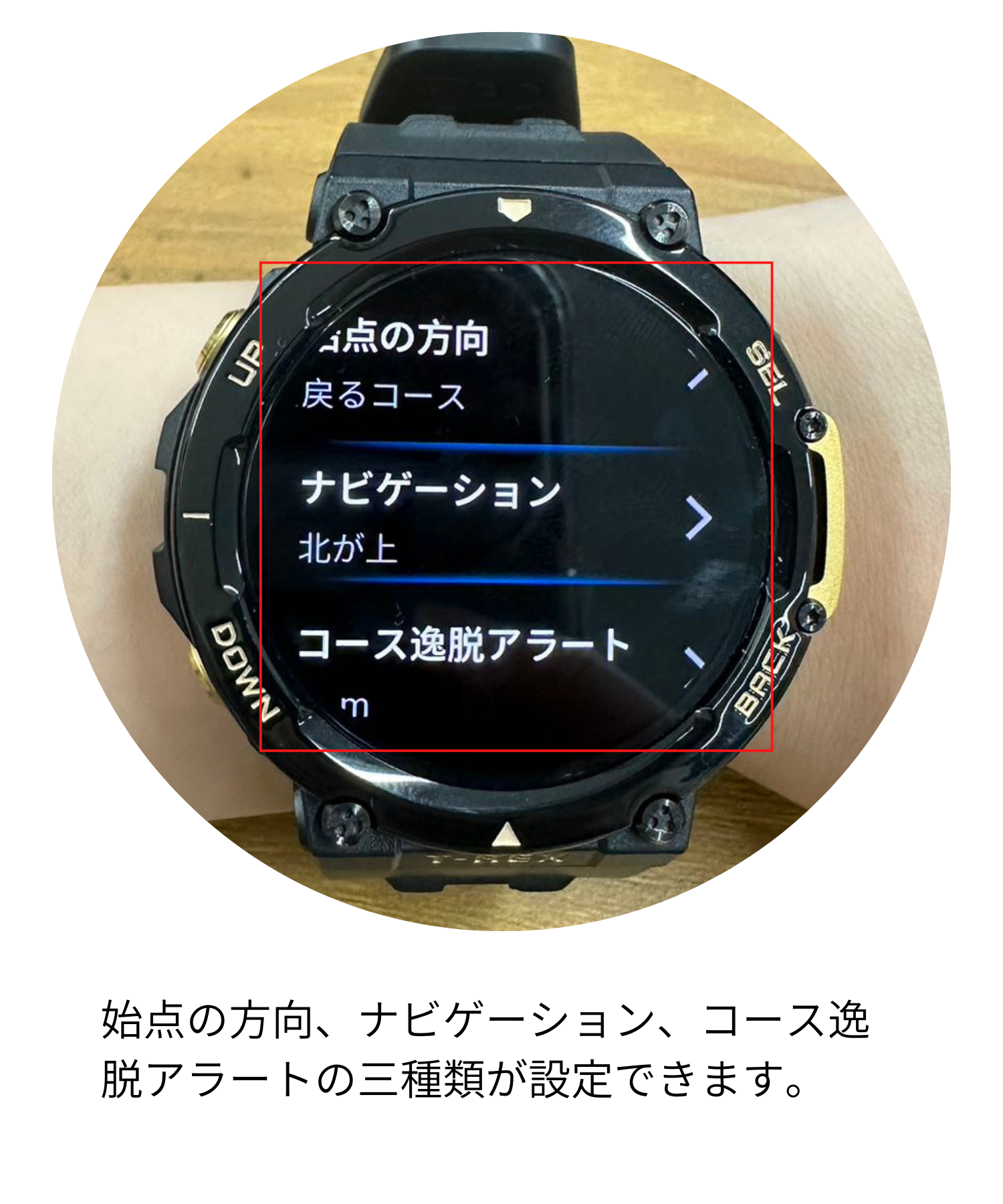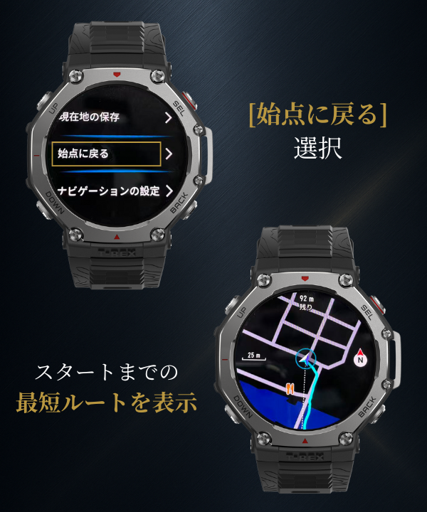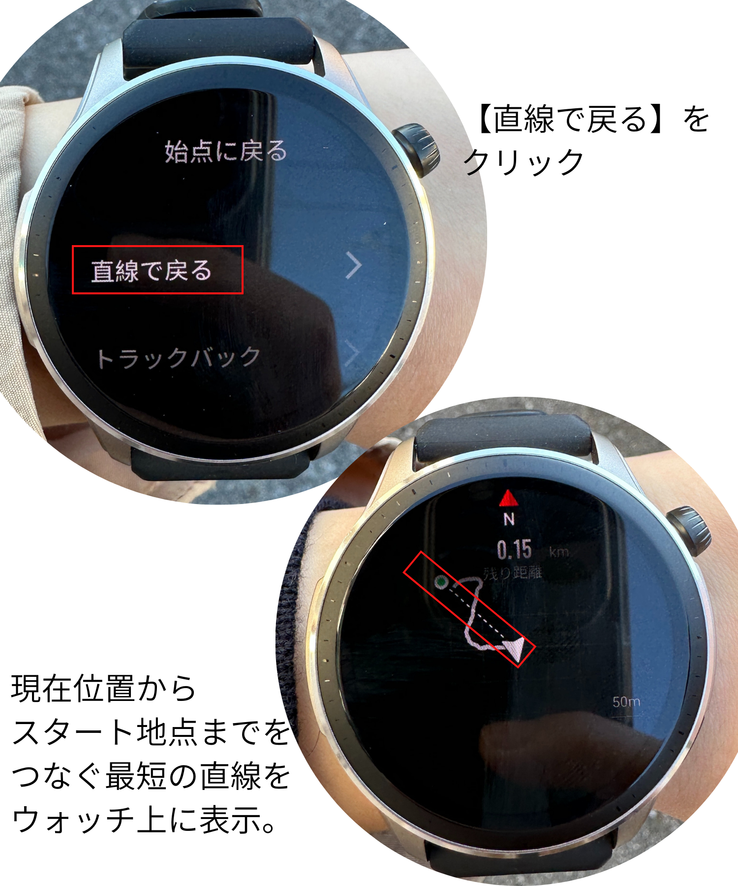 現在位置からスタート地点までをつなぐ最短の直線をウォッチ上に表示します。