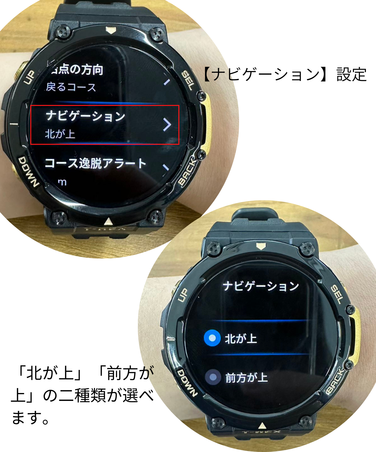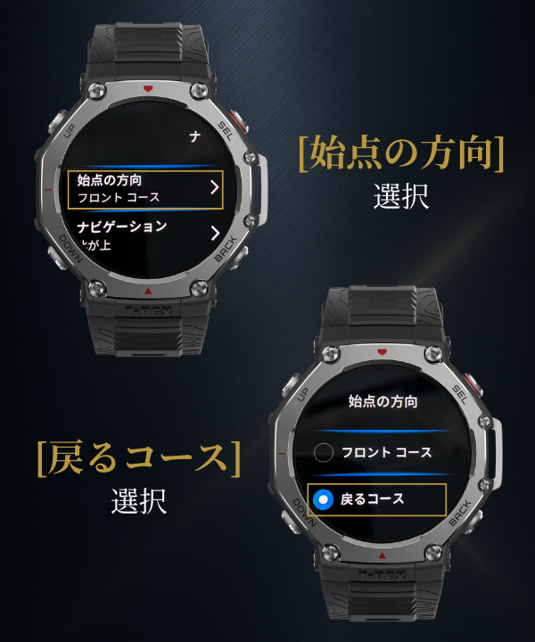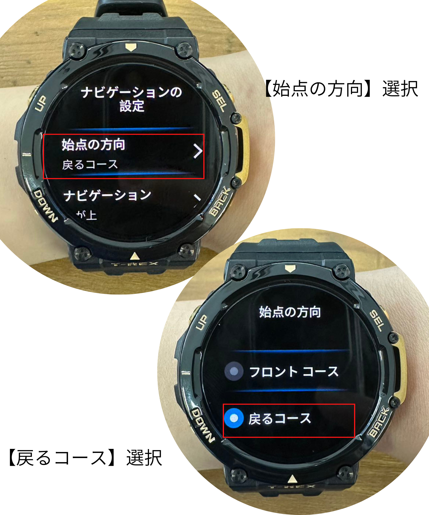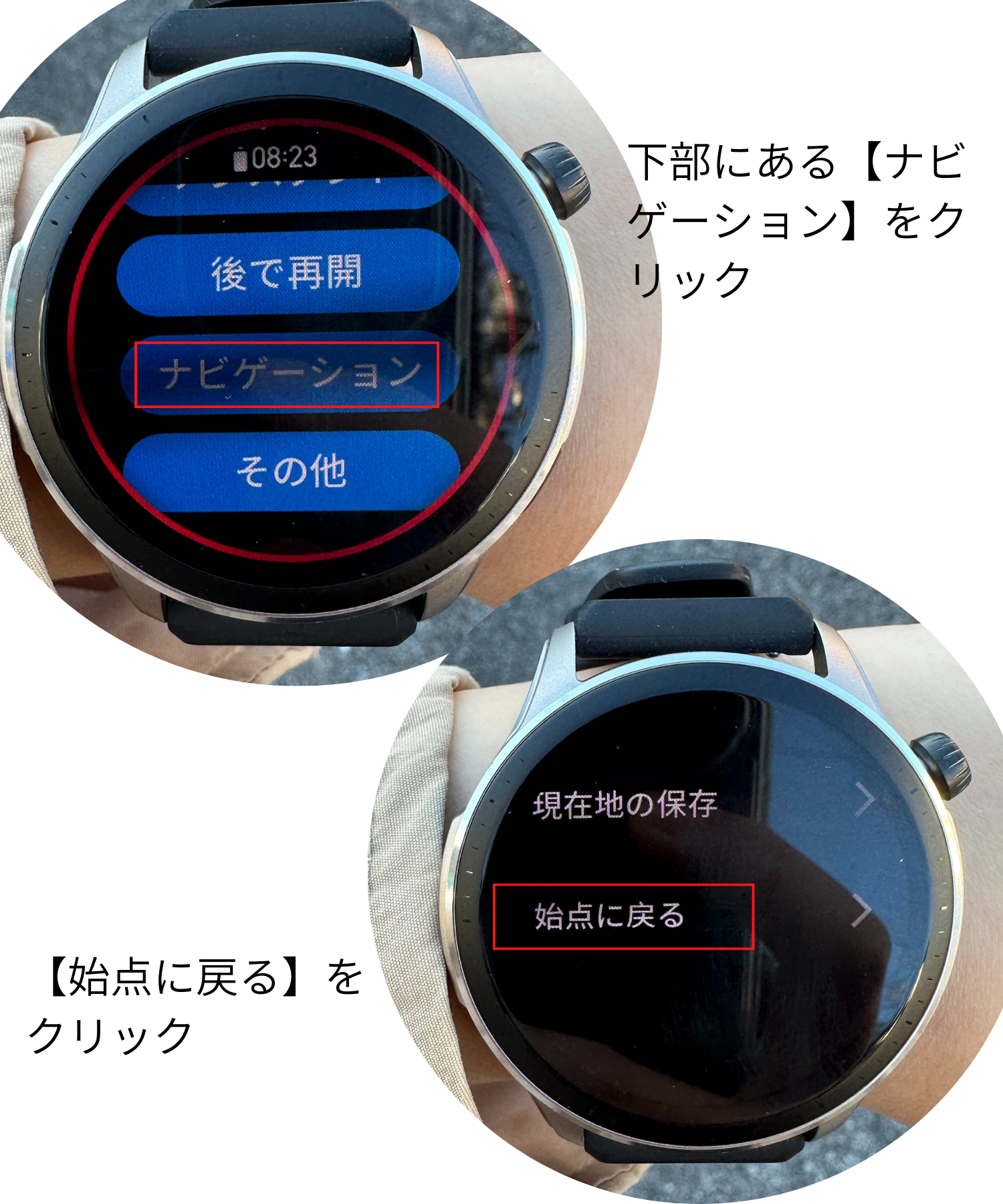 現在位置からスタート地点までをつなぐ最短の直線をウォッチ上に表示します。