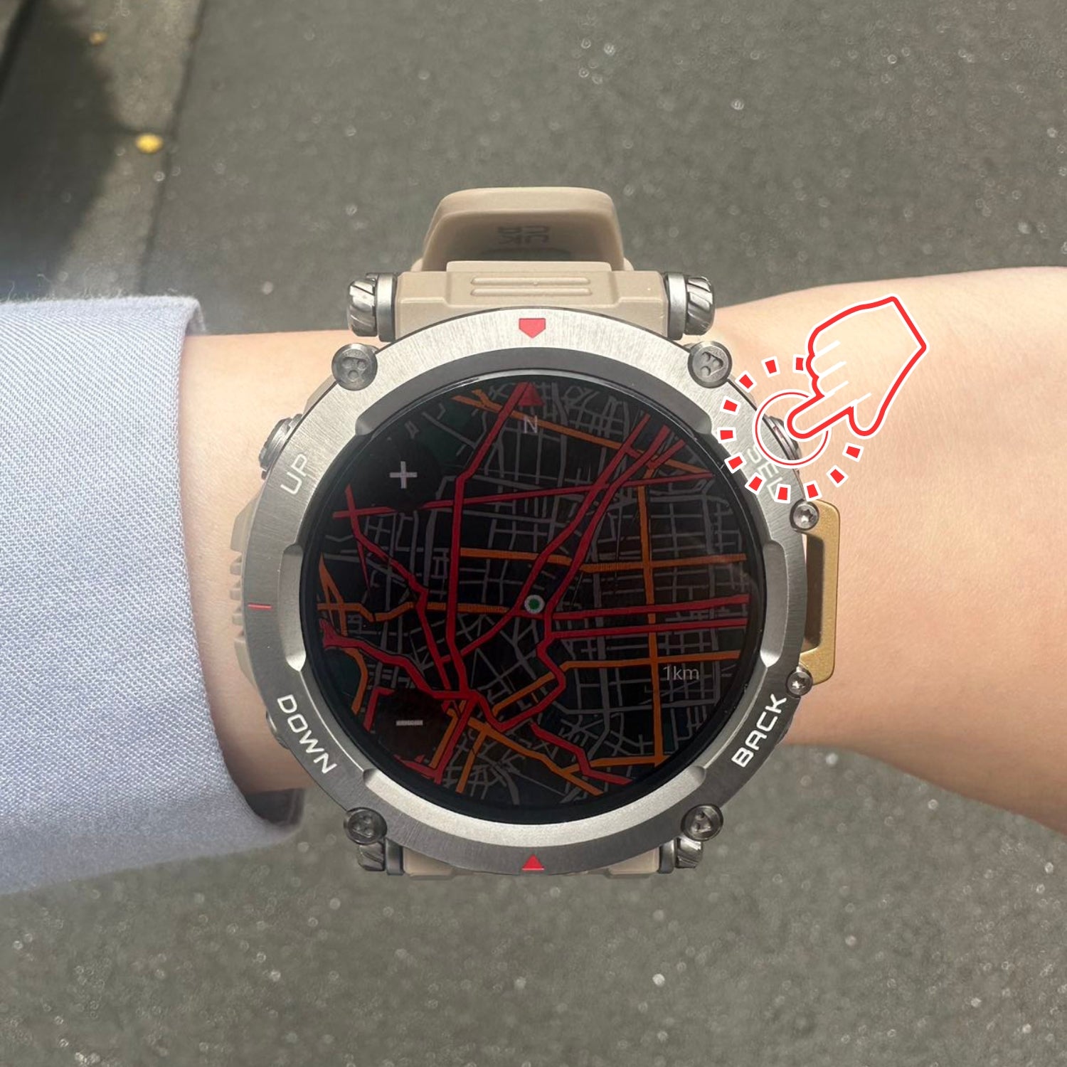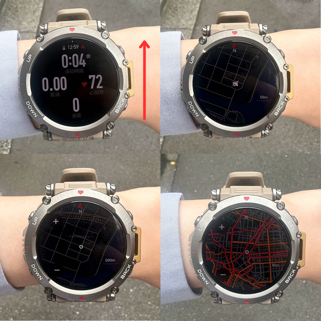 屋外スポーツモードでは、事前にダウンロードしたマップをウォッチ上に表示できます。地図上でのルートナビゲーションにも対応しています。