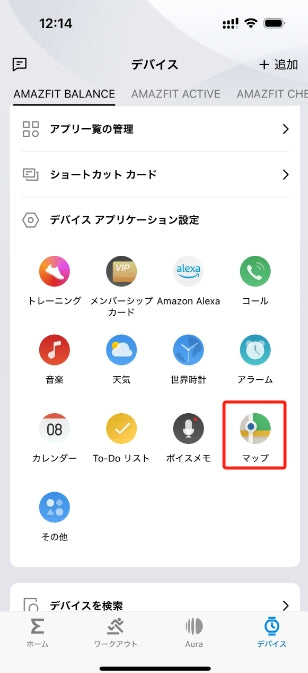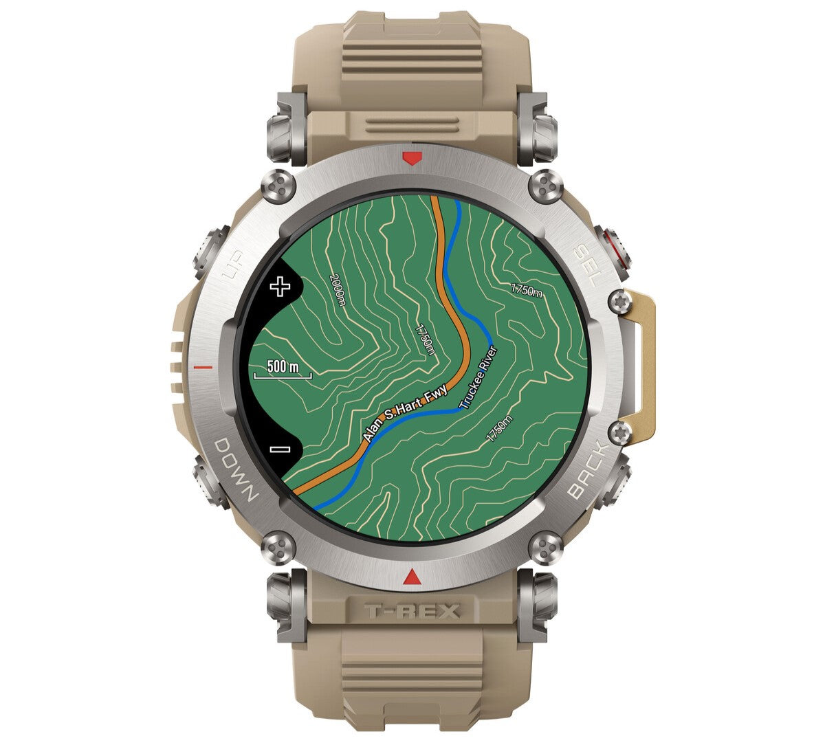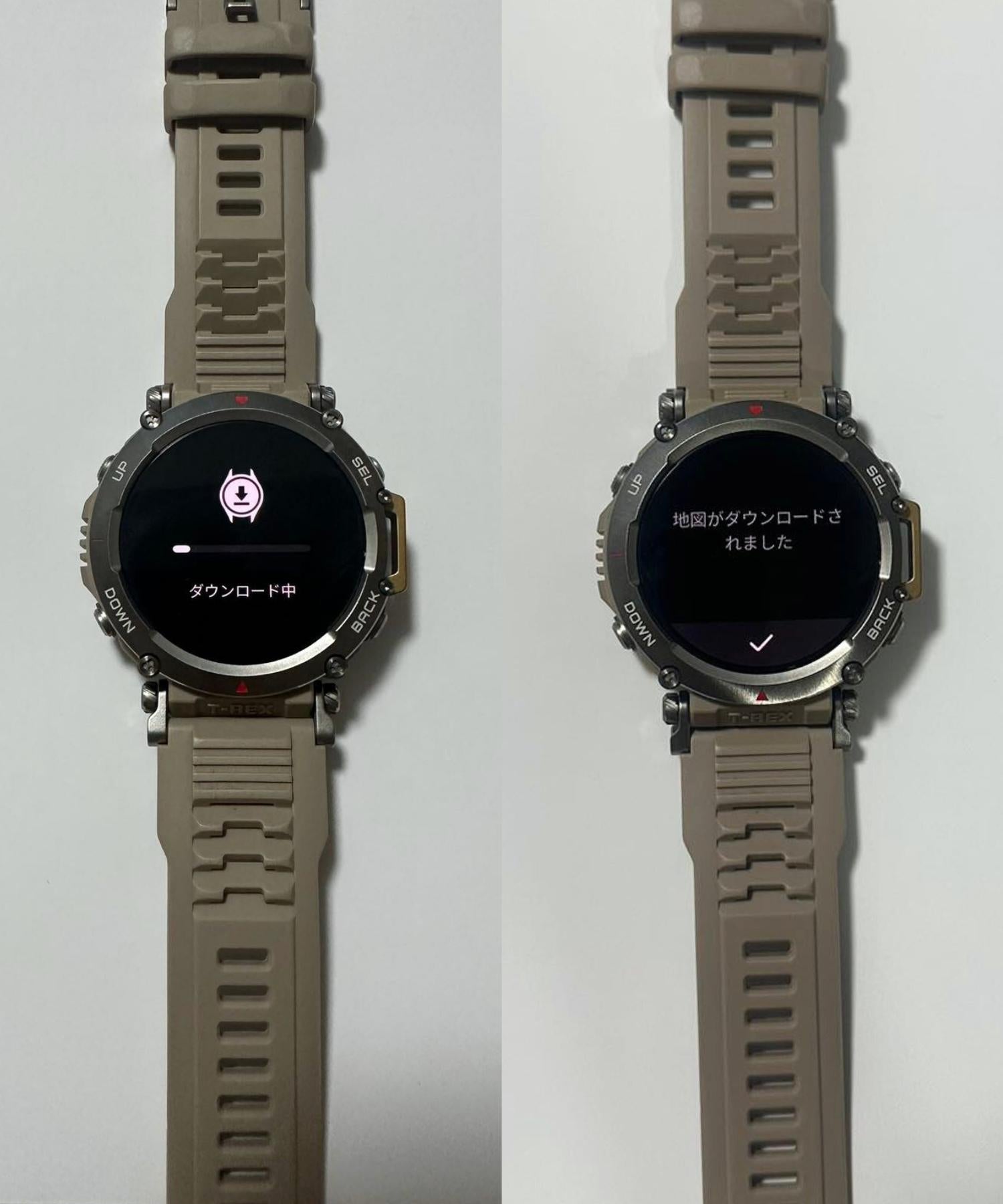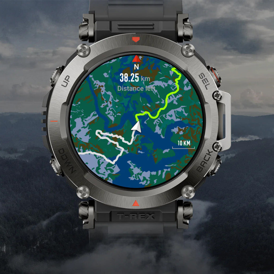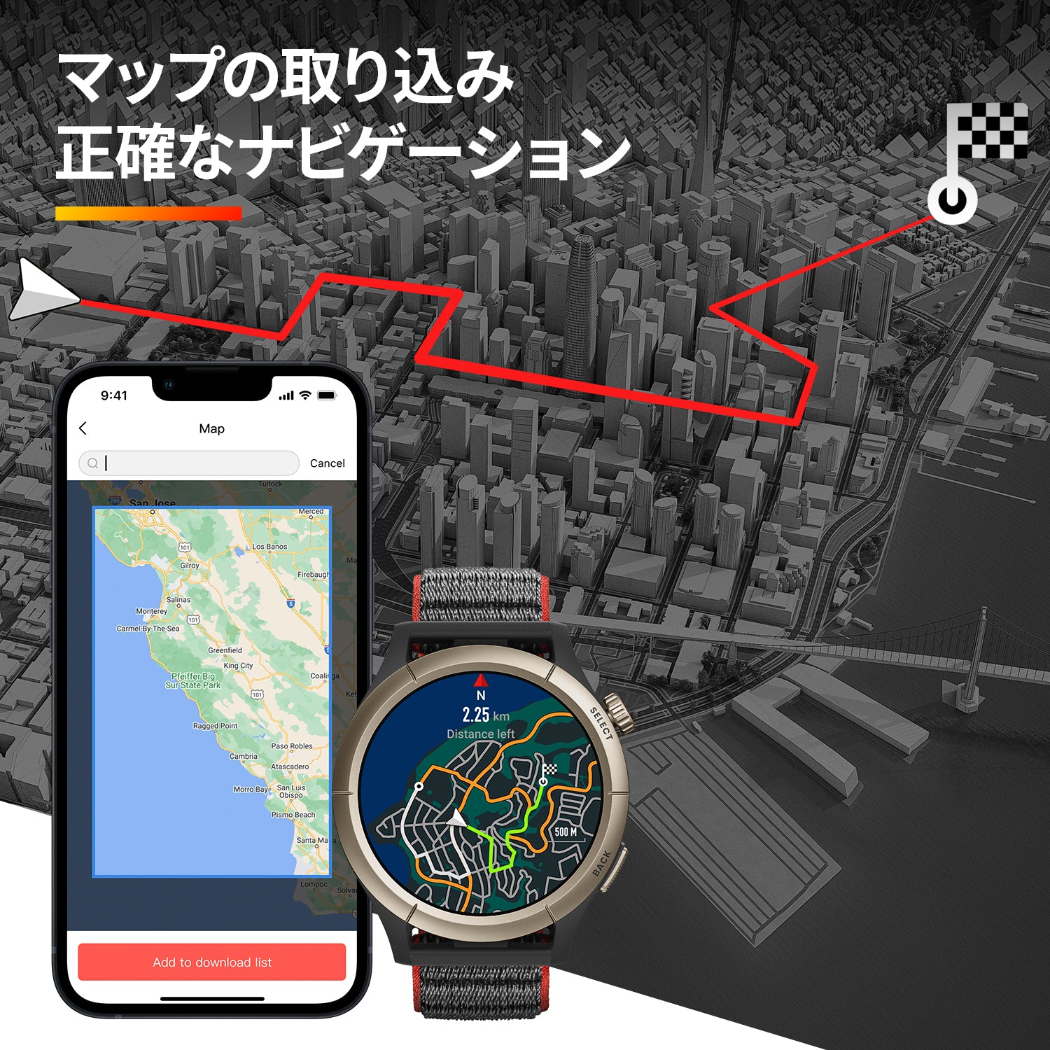 屋外スポーツモードでは、事前にダウンロードしたマップをウォッチ上に表示できます。地図上でのルートナビゲーションにも対応しています。