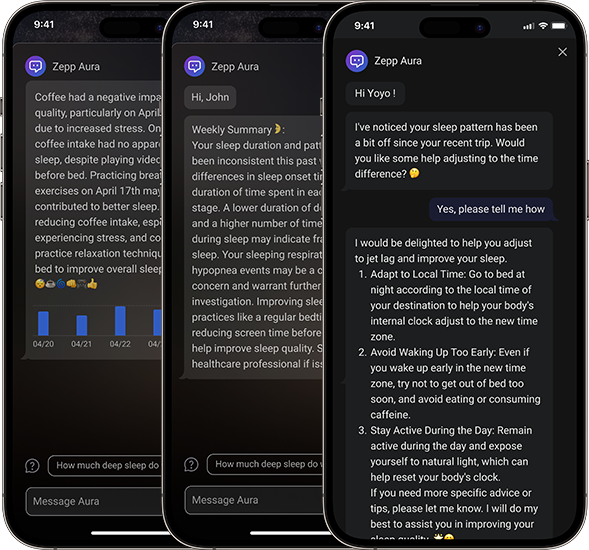 AI及び独自の特許技術を駆使したZepp Auraは、専門家のアドバイス・詳細な睡眠レポート・そして強力な洞察をすることで、より良い睡眠へと導きます。