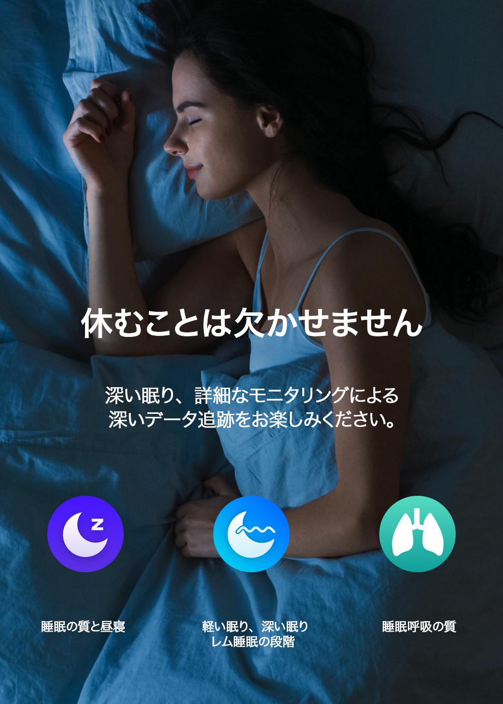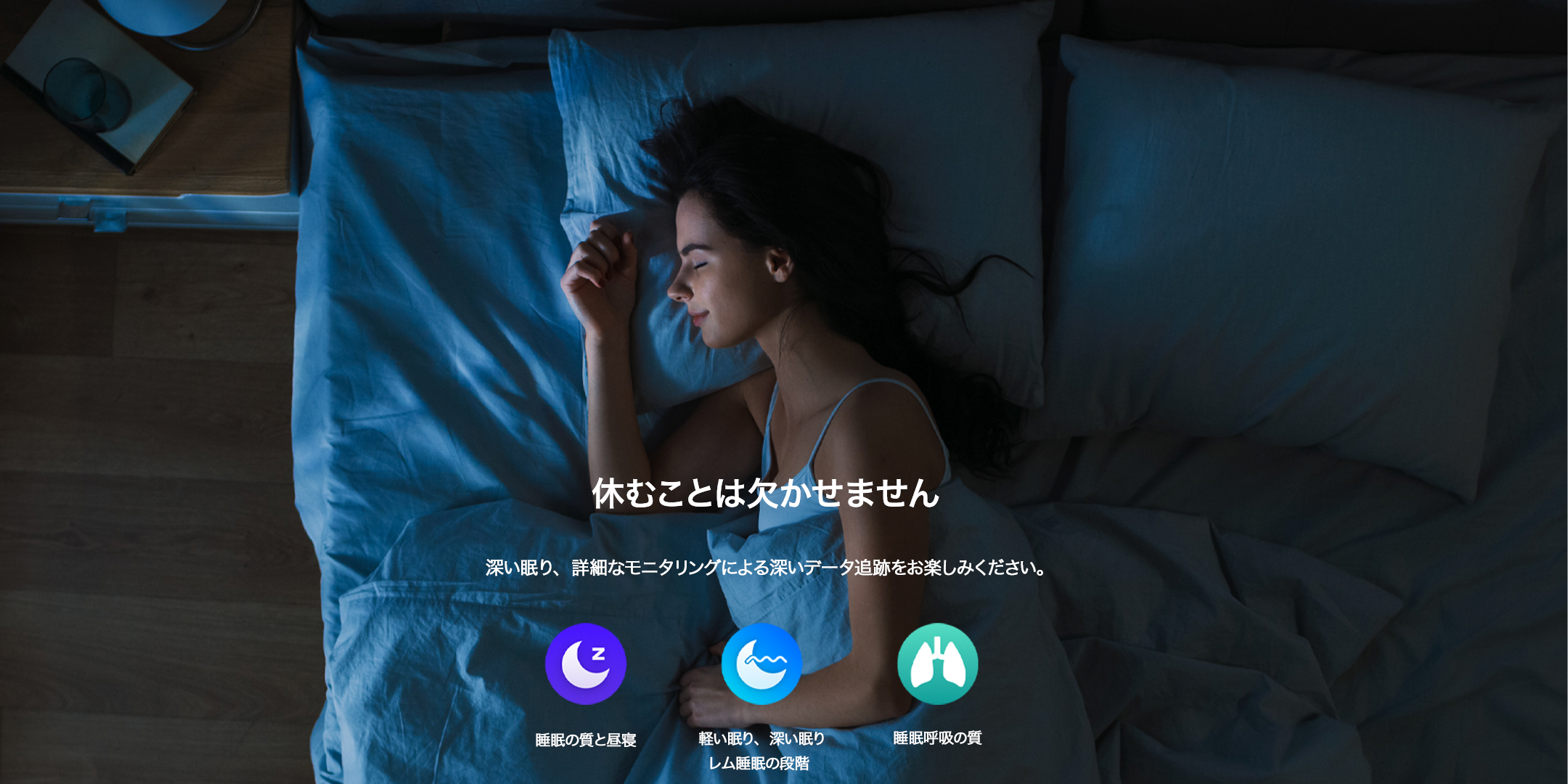 | 睡眠の質のモニタリング | 睡眠段階(REMを含む) 昼寝の時間/睡眠時の呼吸の質/睡眠スコア |