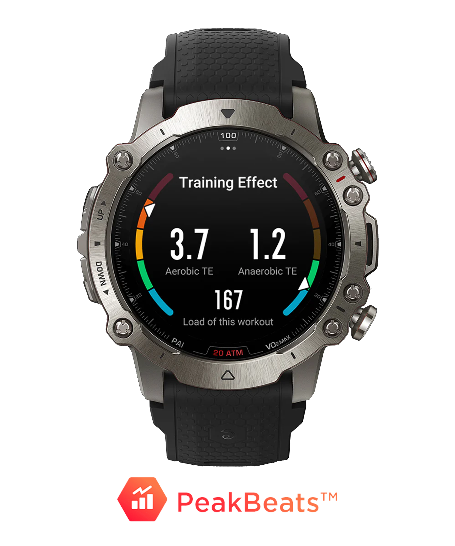 | ワークアウトステータス | PeakBeats™ (Vo2Max、完全回復時間、トレーニングの負荷・効果など) |