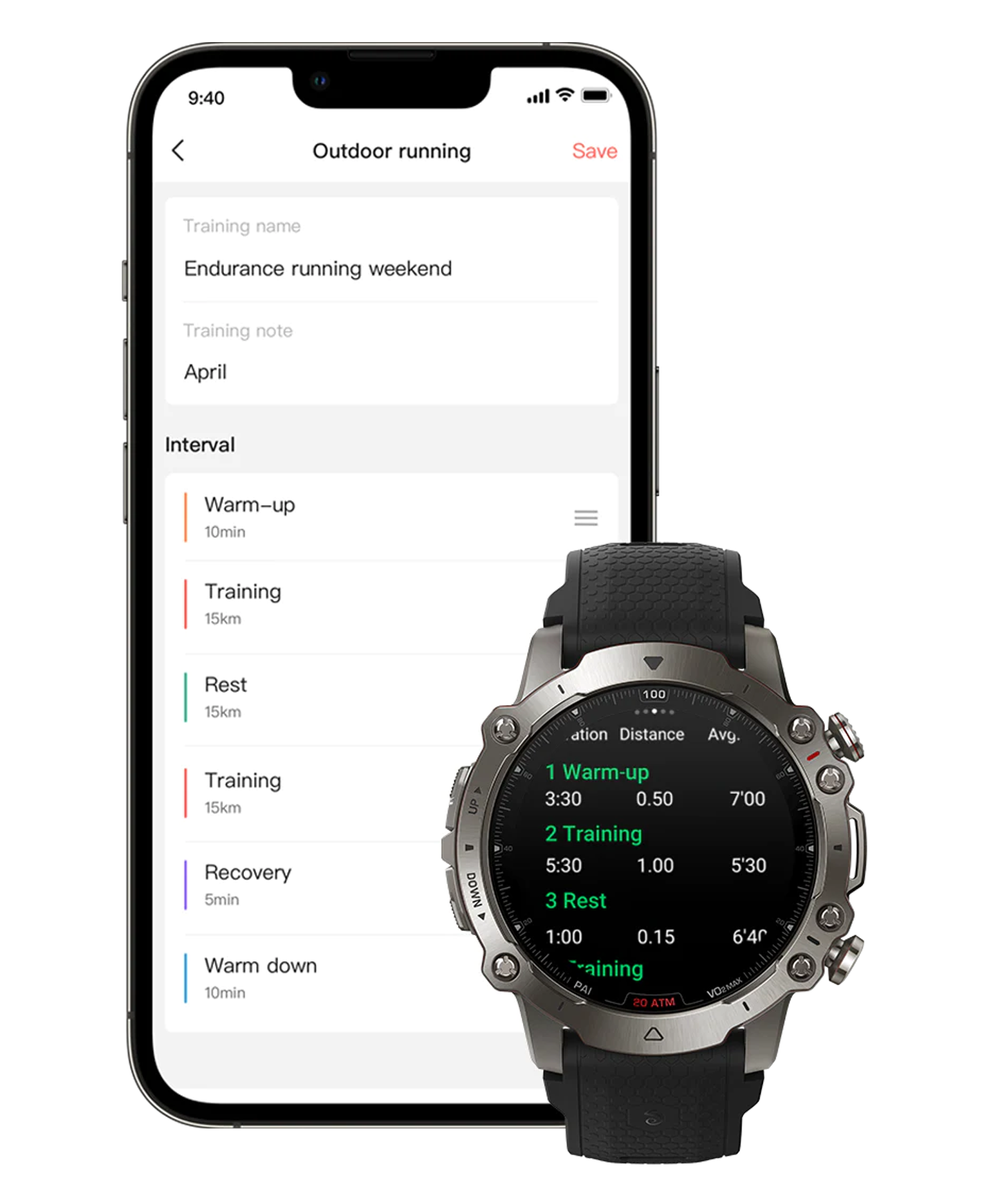 9. トレーニングテンプレート、インターバルトレーニング対応のスポーツモード:ランニング(屋外)、トレッドミル、サイクリング(屋外)、サイクリング(屋内)、縄跳び、ローイングマシン、フィットネス(屋内)、コアトレーニング、筋力トレーニング、階段昇降、プールスイミングです。トレーニングテンプレートは Zepp アプリで作成する必要があり、一度に 40 個まで保存可能。インターバルトレーニングはウォッチ上で直接設定できます。