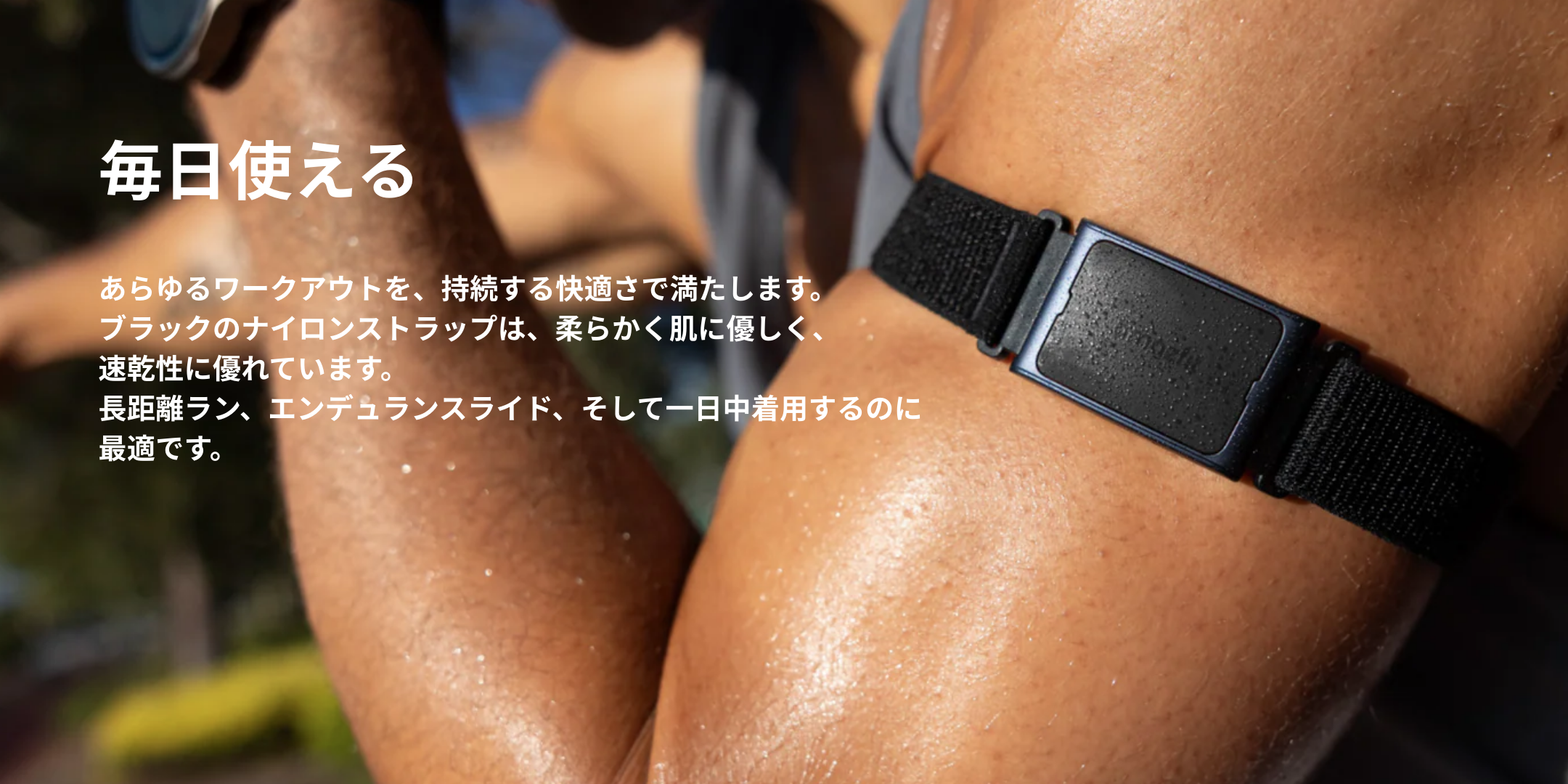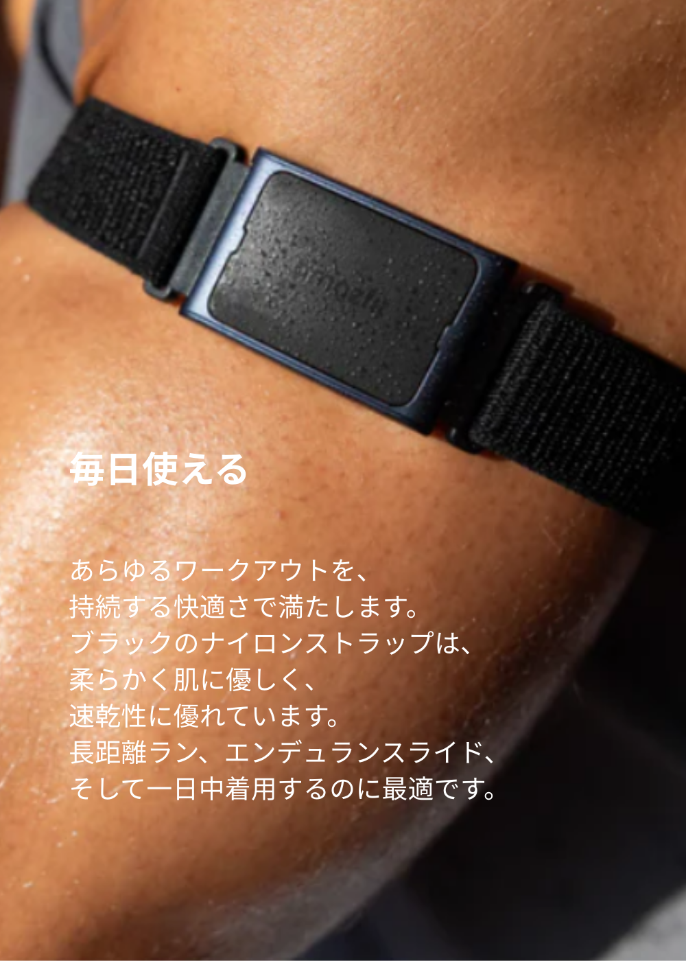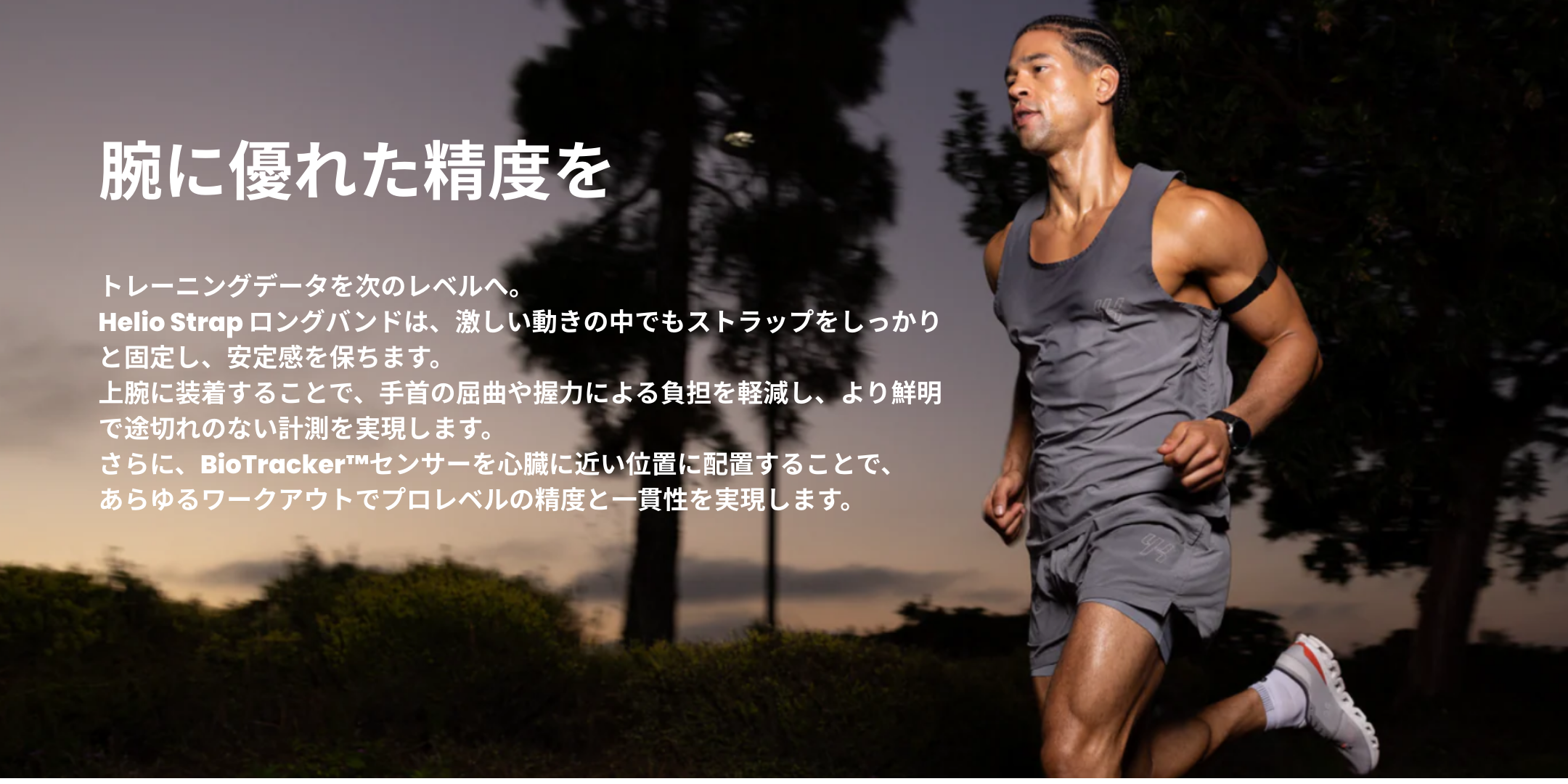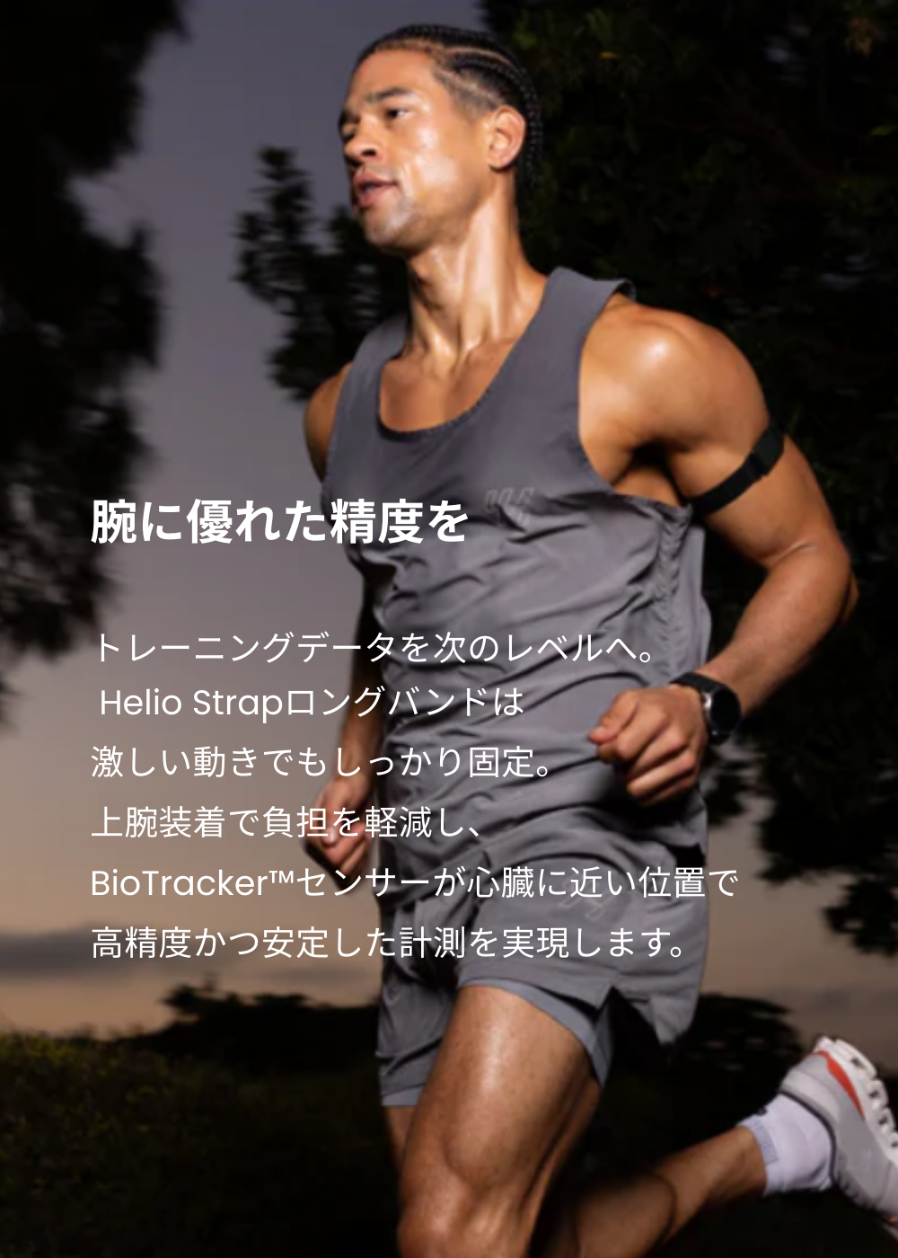 あらゆるワークアウトで信頼できるパフォーマンスを得るには、Helio Strapロングバンドを上腕部に装着してください。