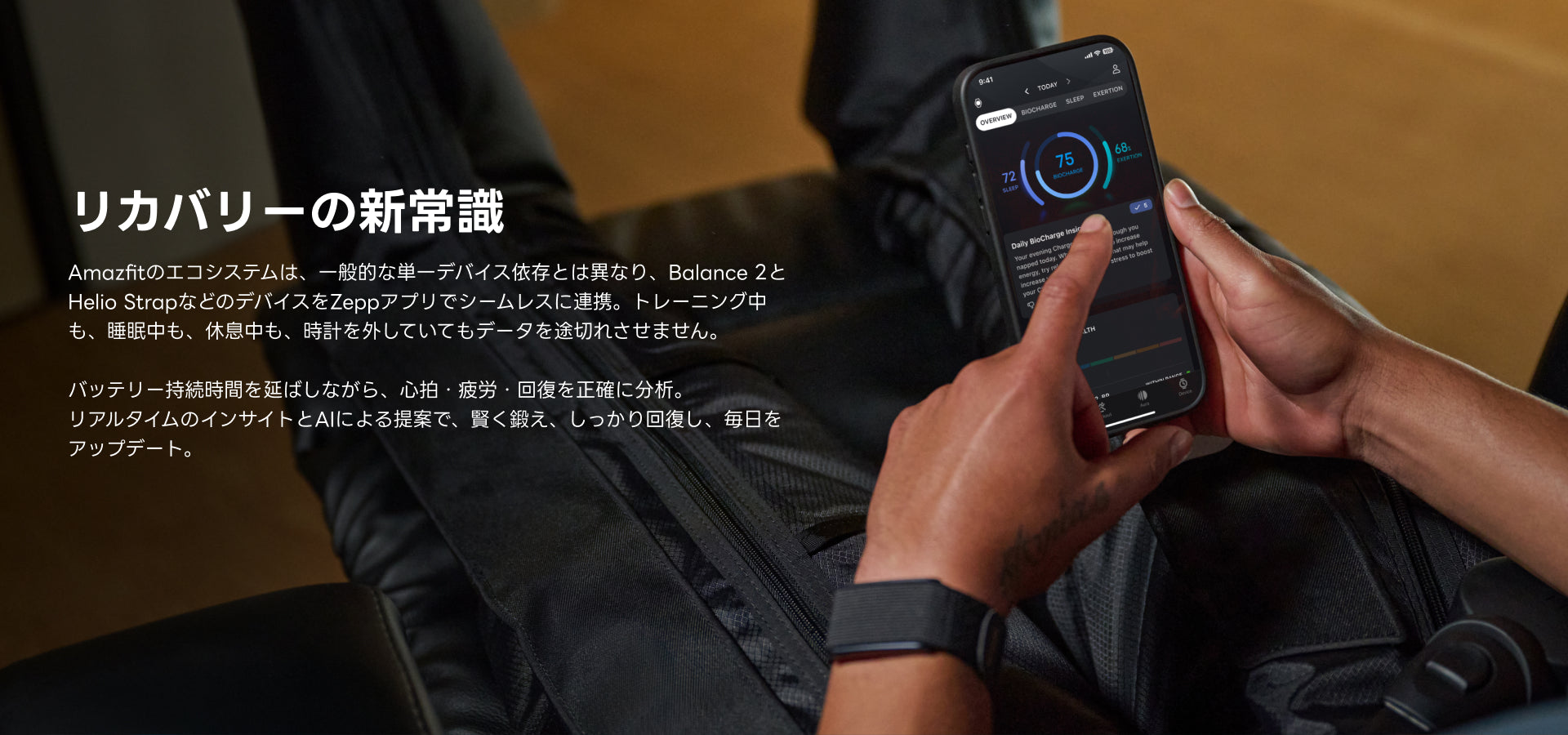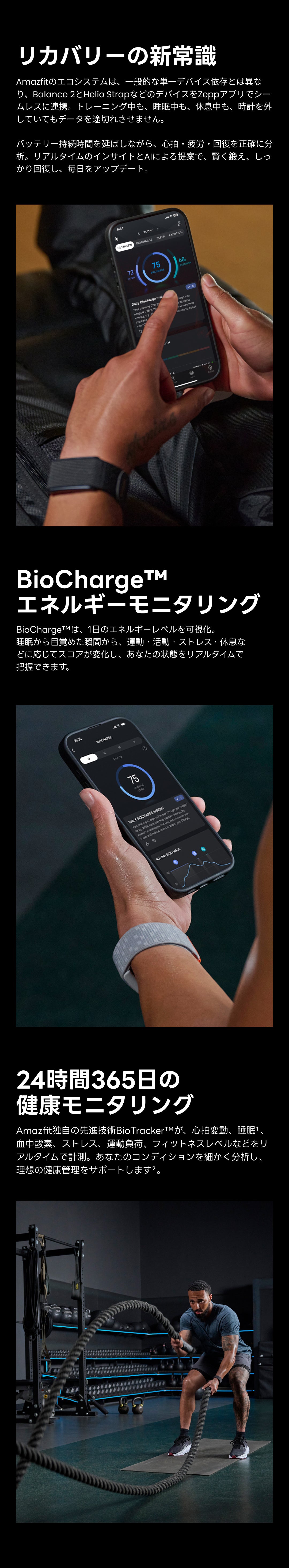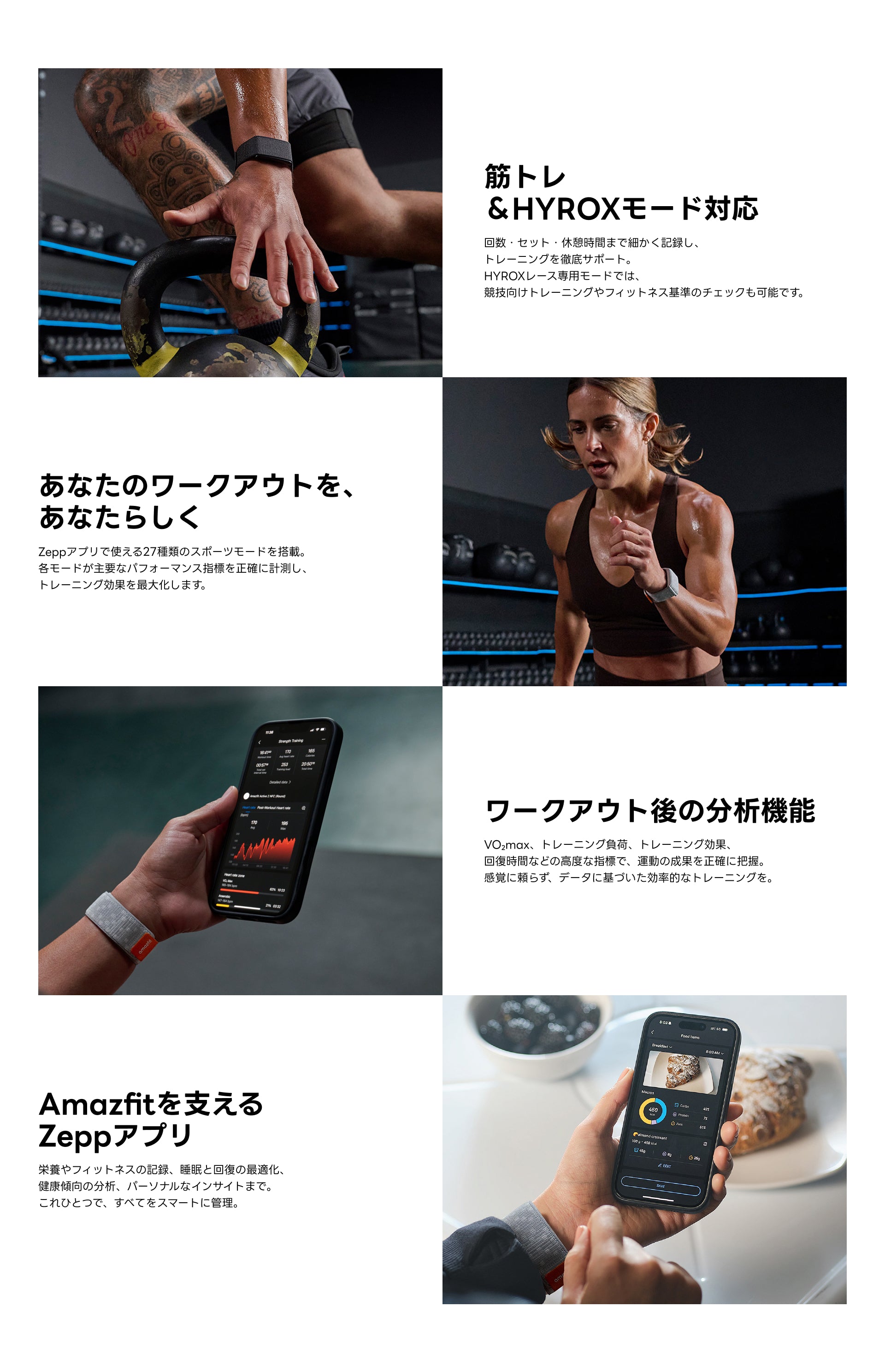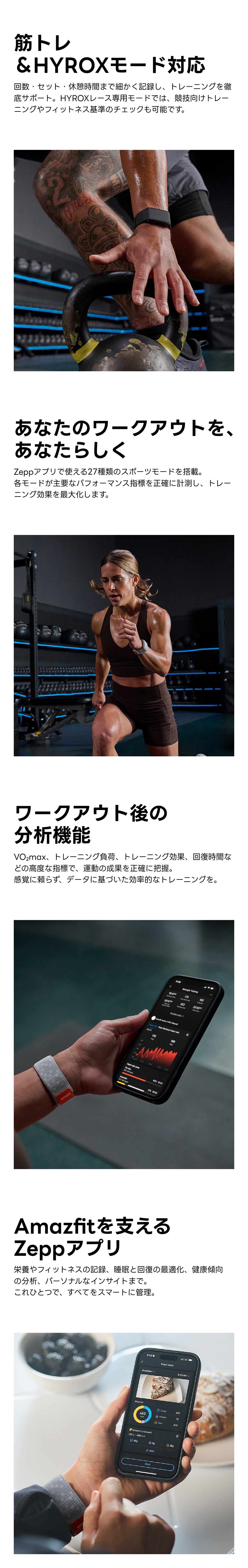 ※上記の製品画像およびZeppアプリの画面内容は参考用です。実際の製品(外観、カラー、サイズなどを含むがこれに限らない)およびZeppアプリの画面表示内容(背景、UI、グラフィックなどを含むがこれに限らない)は若干異なる場合があります。