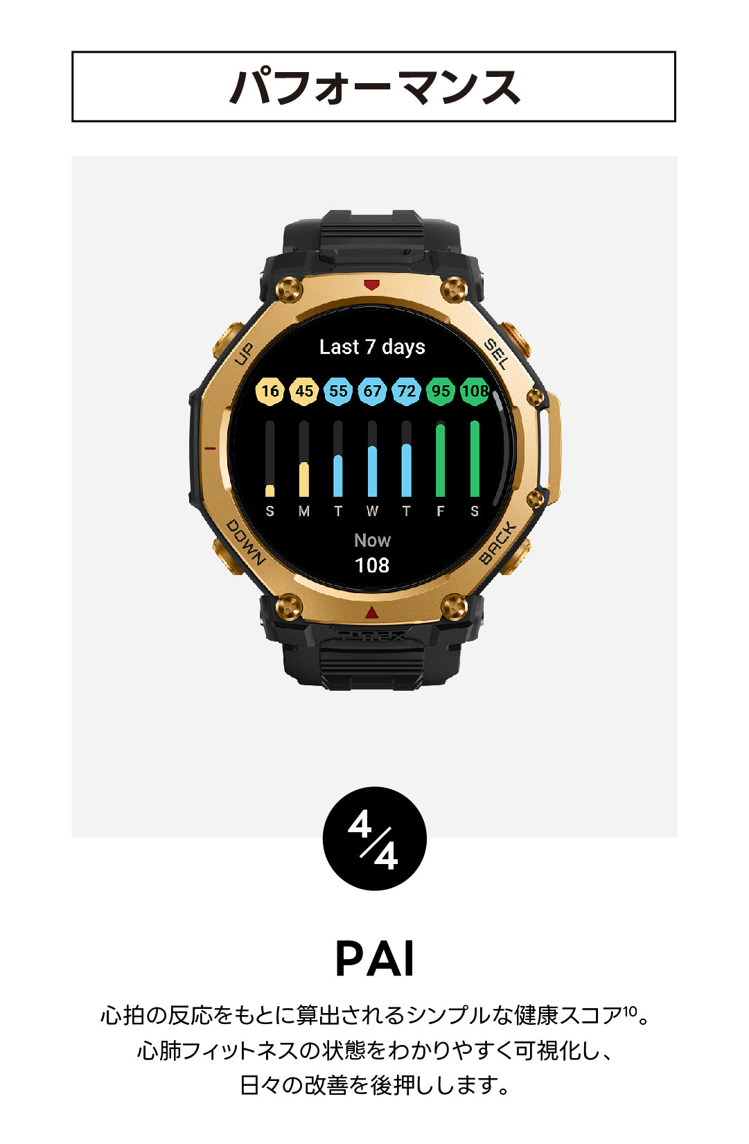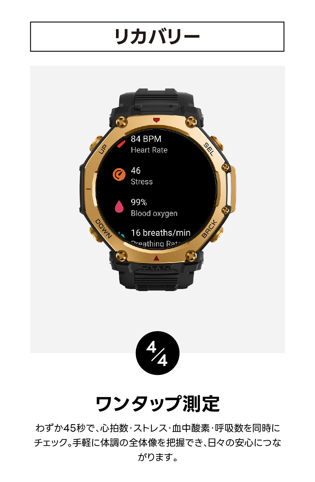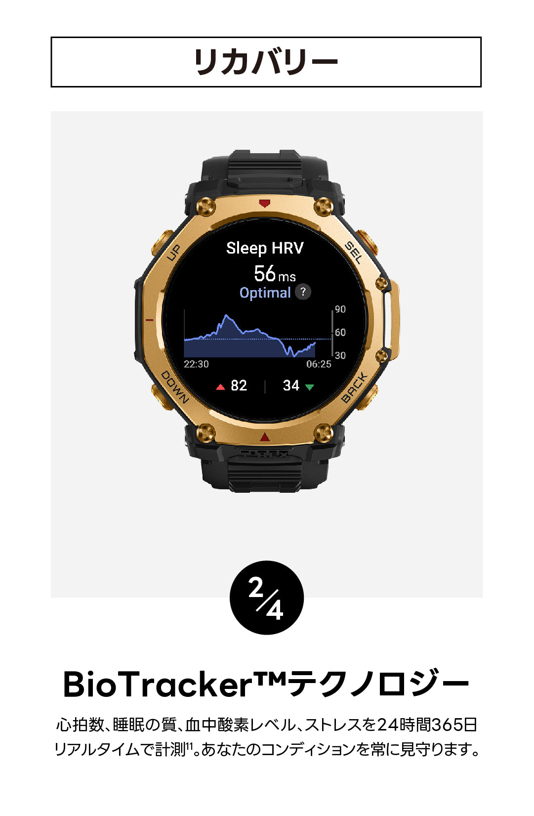 | 24時間モニタリング | 心拍数/血中酸素レベル/ストレスレベル |