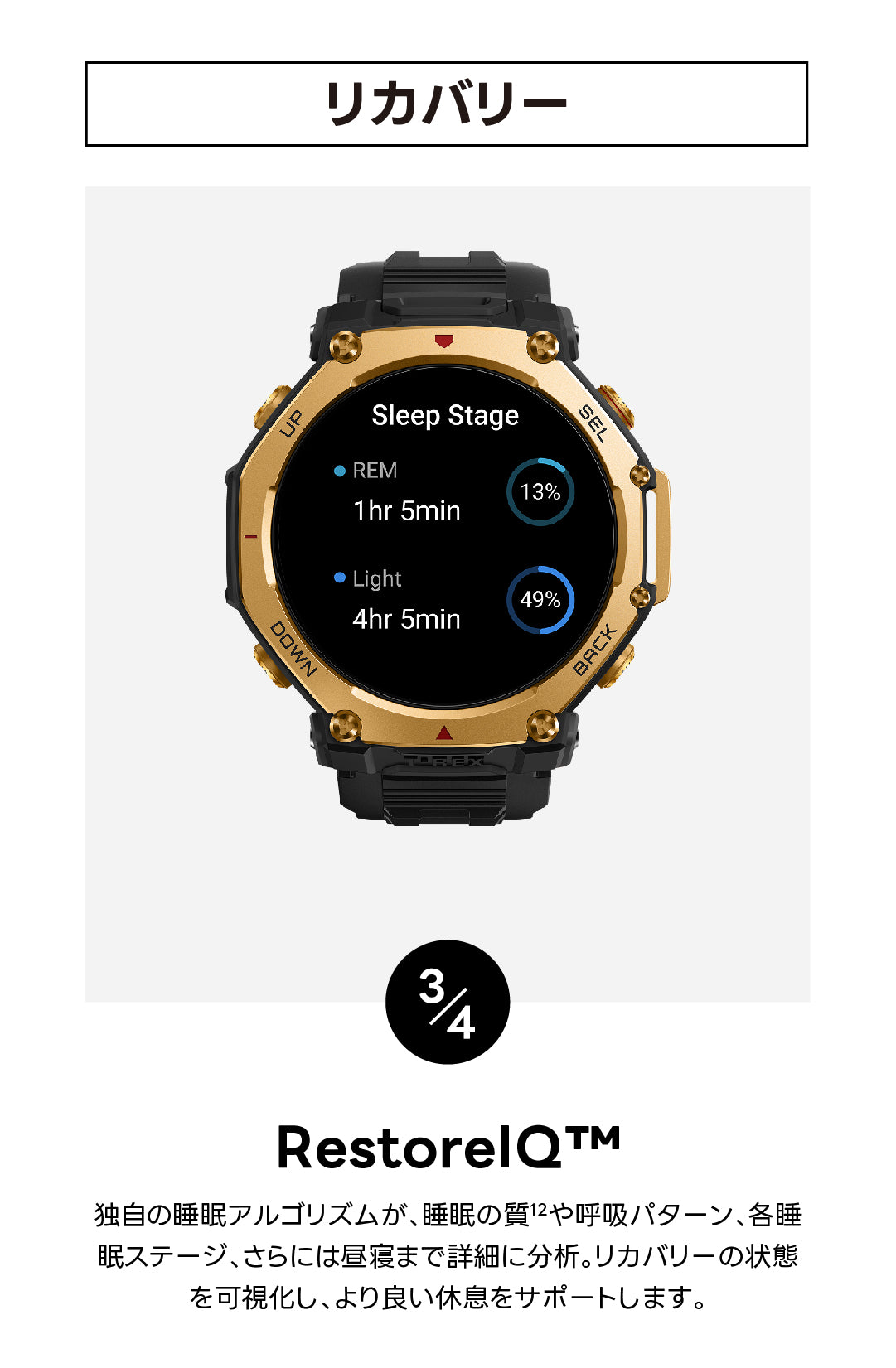 | 睡眠の質のモニタリング | 睡眠段階(REMを含む) 昼寝の時間/睡眠スケジュール/睡眠時の呼吸の質/睡眠スコア |
