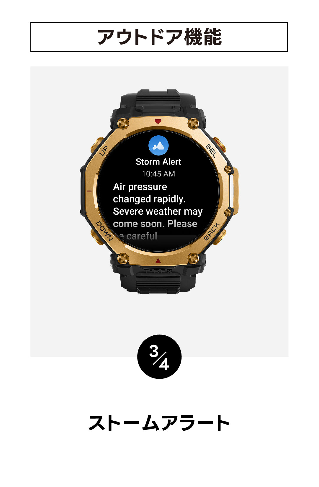 | 健康リマインダー | 心拍数の異常/低血中酸素/高ストレスレベル/呼吸エクササイズ/座り過ぎのリマインダー |