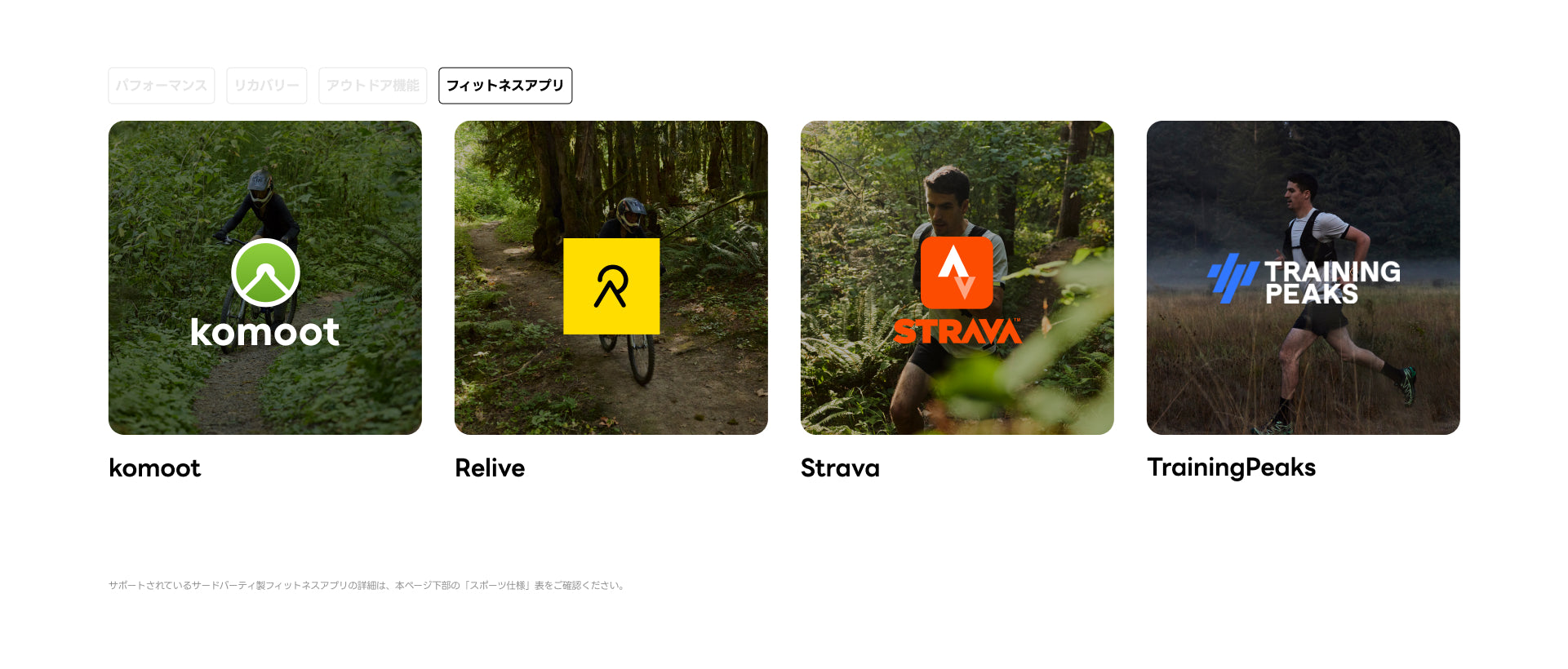 ランニング(屋外)、ウォーキング、ランニングマシン、ウォーキング(屋内)、トレイルランニング、競歩、運動場でのランニング、ウルトラマラソン、犬の散歩