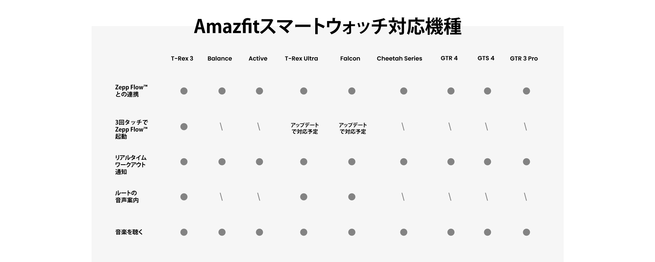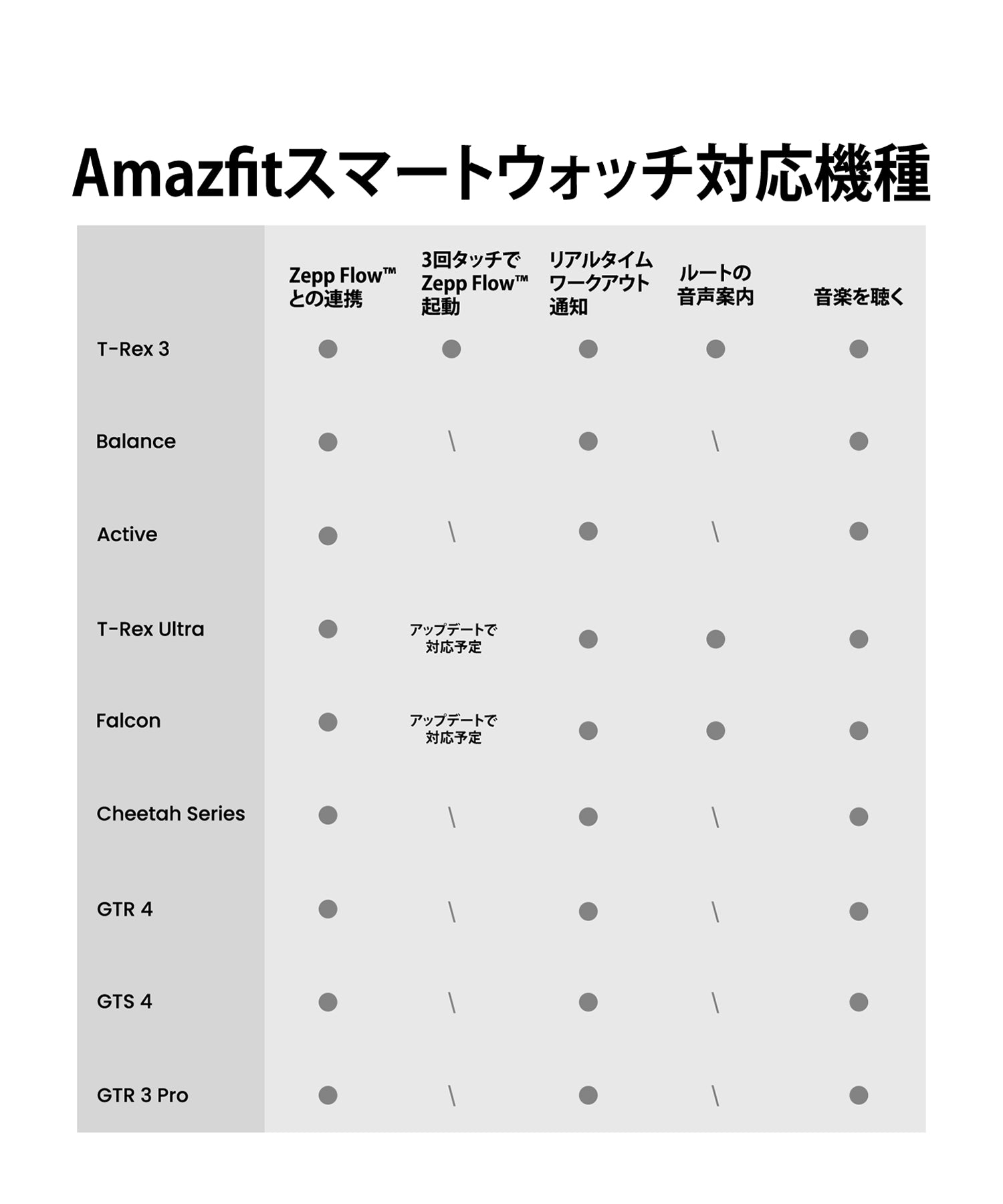 4. Zepp Flow™は、特定のAmazfitスマートウォッチ(Amazfit Balance、T-Rex 3、T-Rex Ultra、Active、Falcon、Cheetah Pro、Cheetah)のみで対応しています。現在、対応言語は英語、フランス語、ドイツ語、イタリア語、スペイン語、日本語、韓国語、ポルトガル語です。
